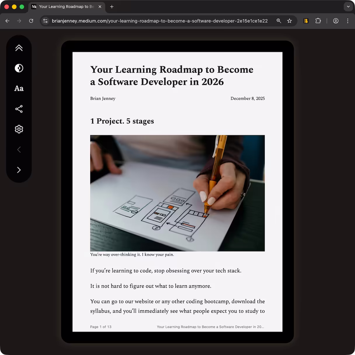 Article extraction uses Mozilla Readability — the same library that powers Firefox Reader View. For a fraction of pages it works well, and that's where the simple story ends.